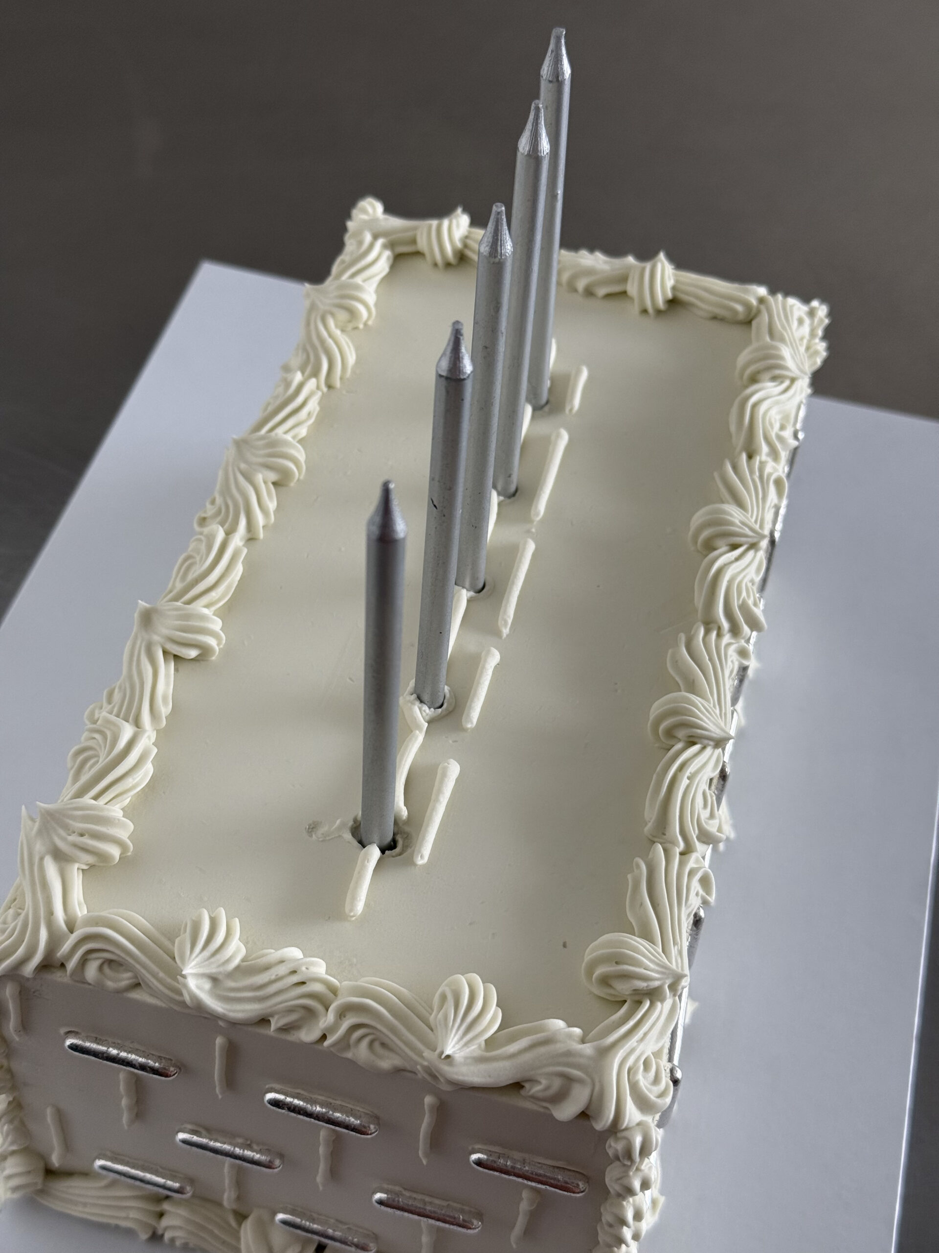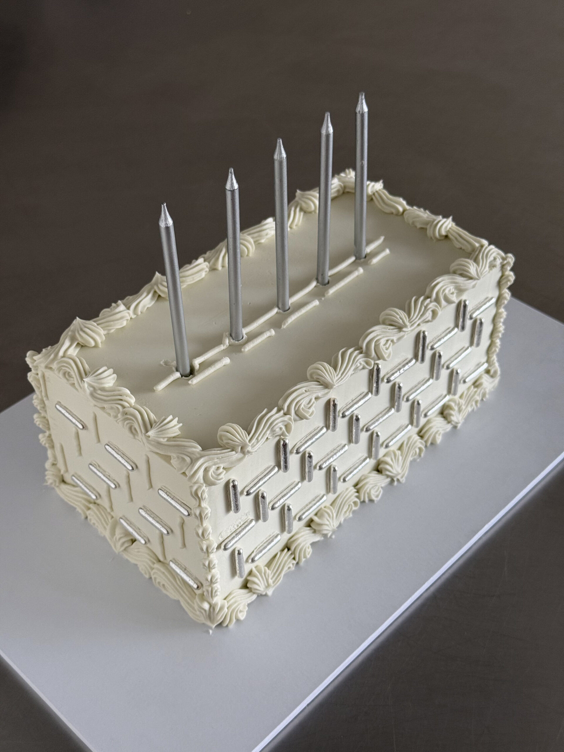 A sleek and contemporary rectangular cake featuring silver sugar rods arranged in a refined geometric pattern. Designed to be finished with a row of candles on top, it’s a modern statement piece fit for any celebration.
