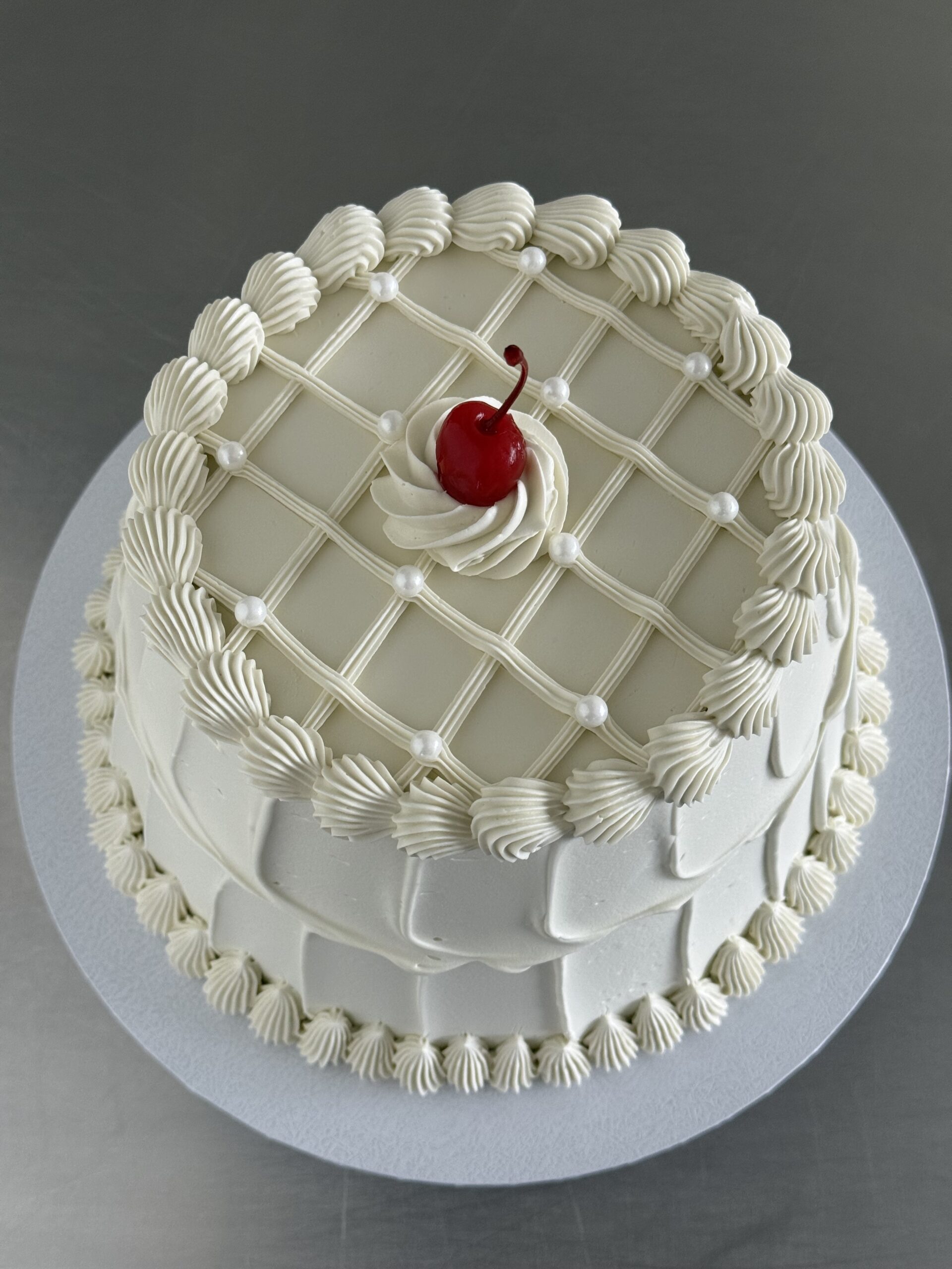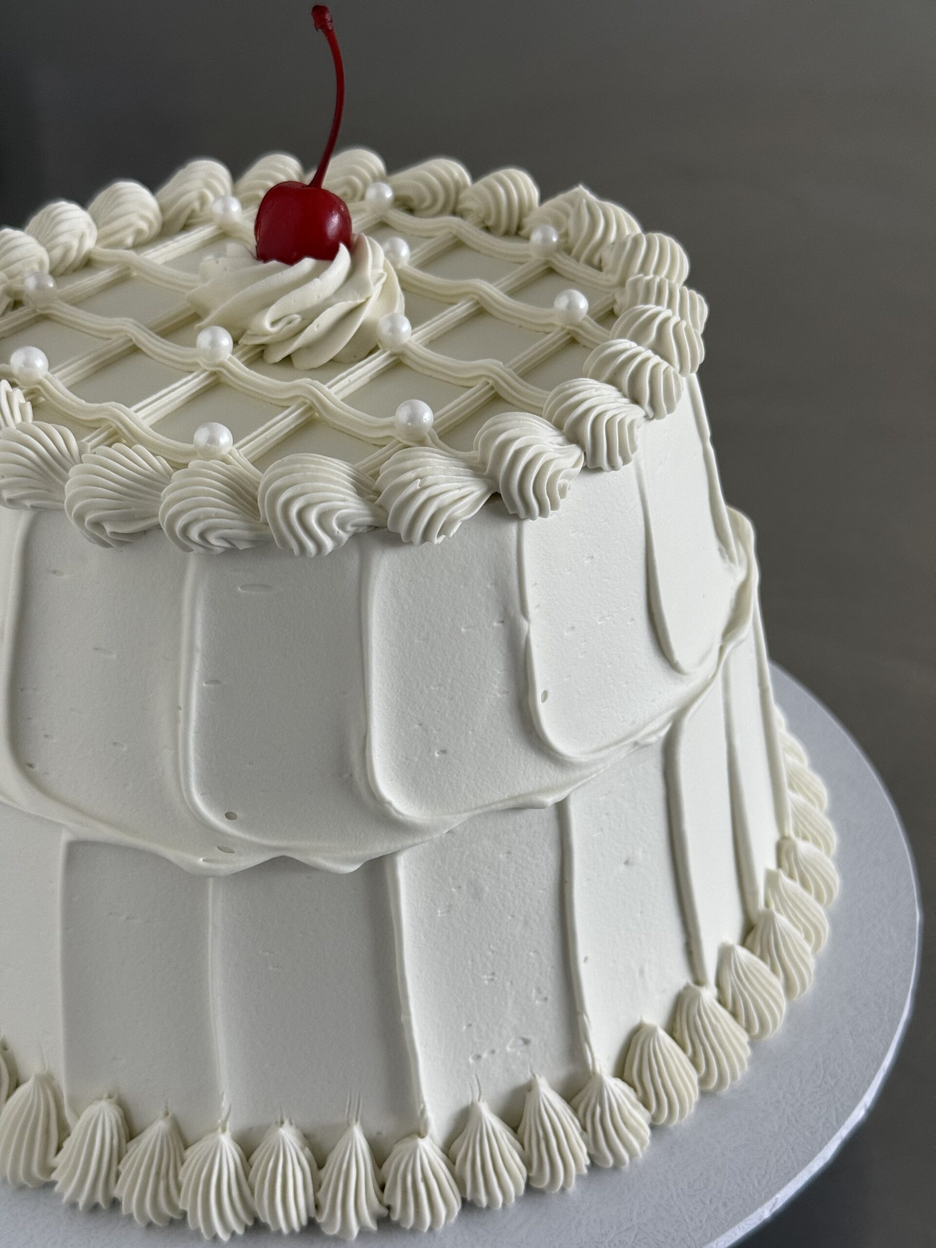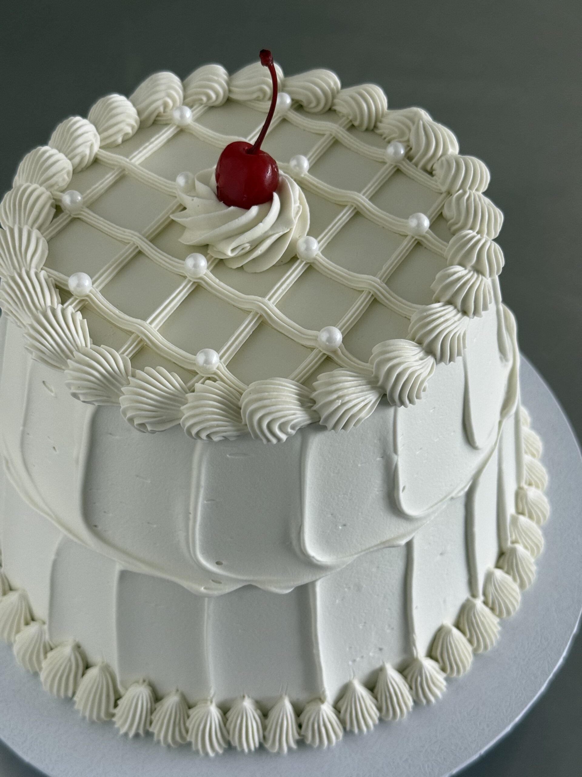 Inspired by retro jelly and pudding desserts, this cake blends nostalgic charm with a modern finish. Soft buttercream draping, classic piping, and a lattice top with pearl accents are finished with a single cherry for a playful yet refined look.